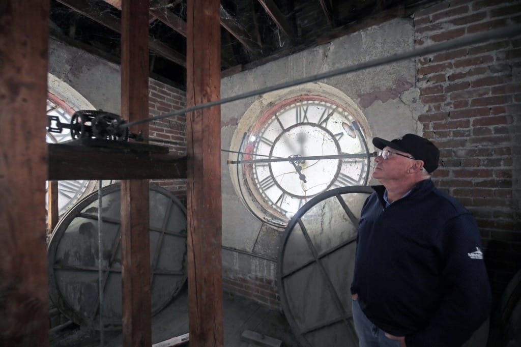 “I learned a lot about clocks in three days,” he said from the tower, in front of mechanical gears. “Most of that was cleaning, but a lot was trying to get the bell system working.”
