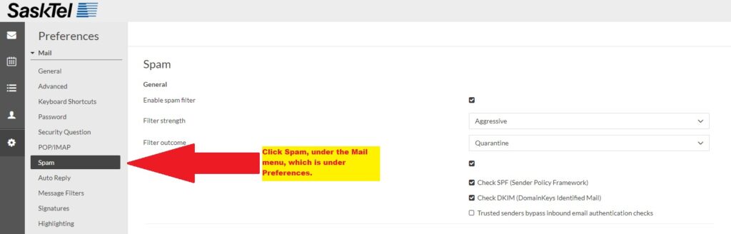 3. Select “Spam” , under the “Preferences” column, which is second from the left and highlighted in light grey.