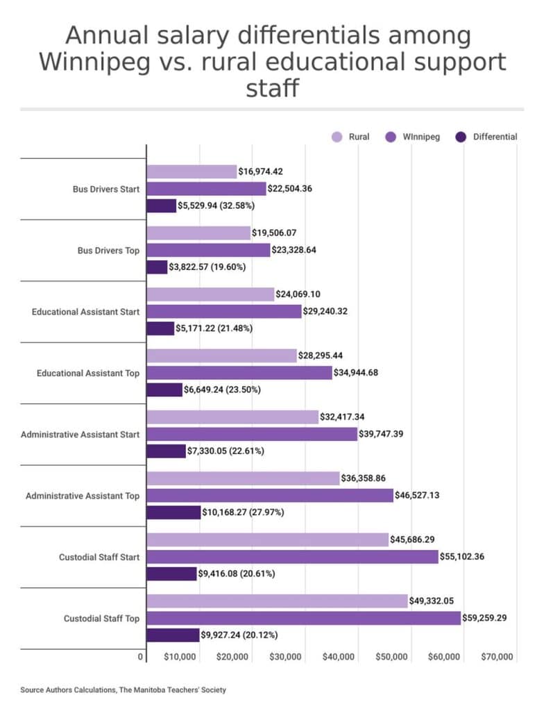 The majority of school support staff in rural Manitoba earn far less than their colleagues in Winnipeg, even when their wages are adjusted for cost-of-living differences.